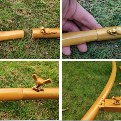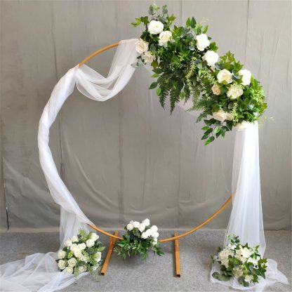 The Round background Stand Wall is made of metal and finished in a crisp goldcolour. It features a classic arch shape with cross-tiers adding to the overall strength.